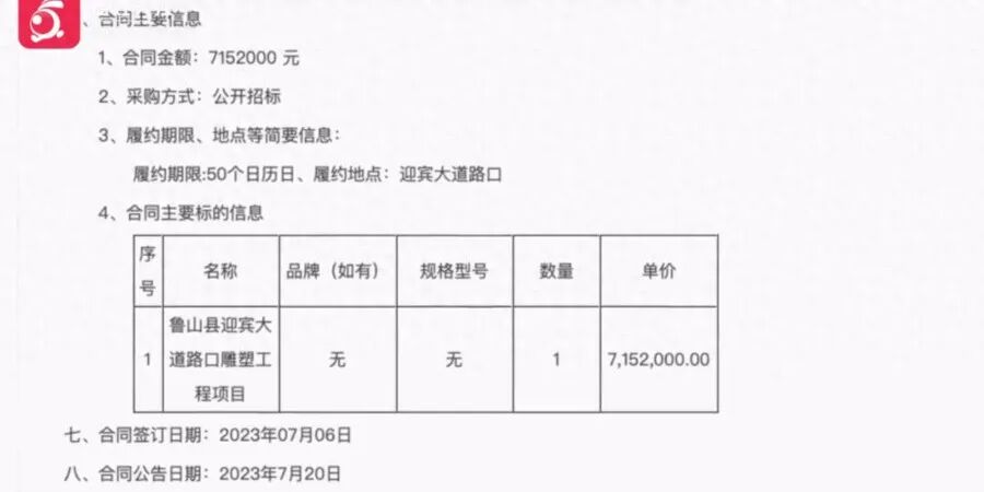 据百姓关注此前报道,记者在河南省政府采购网查询到一份项目合同显示,该项目甲方为鲁山县住房和城乡建设局,乙方为睿泽艺术(深圳)有限公司,合同金额为7152000元。